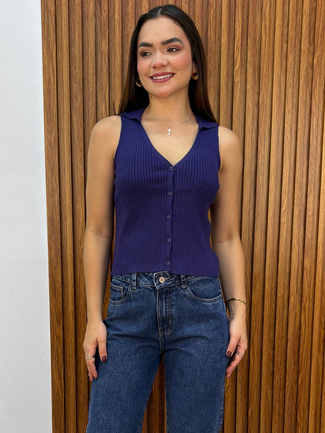 Descubre la versatilidad de nuestro básico tejido en hilo de verano, una prenda imprescindible para crear looks frescos y modernos. Con cuello camisero, mangas cero y botones decorativos en el centro, este top combina estilo y comodidad a la perfección. Su tejido ligero lo convierte en una opción ideal para días cálidos o para usar en capas durante todo el año.