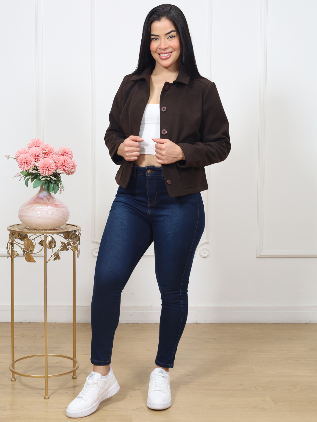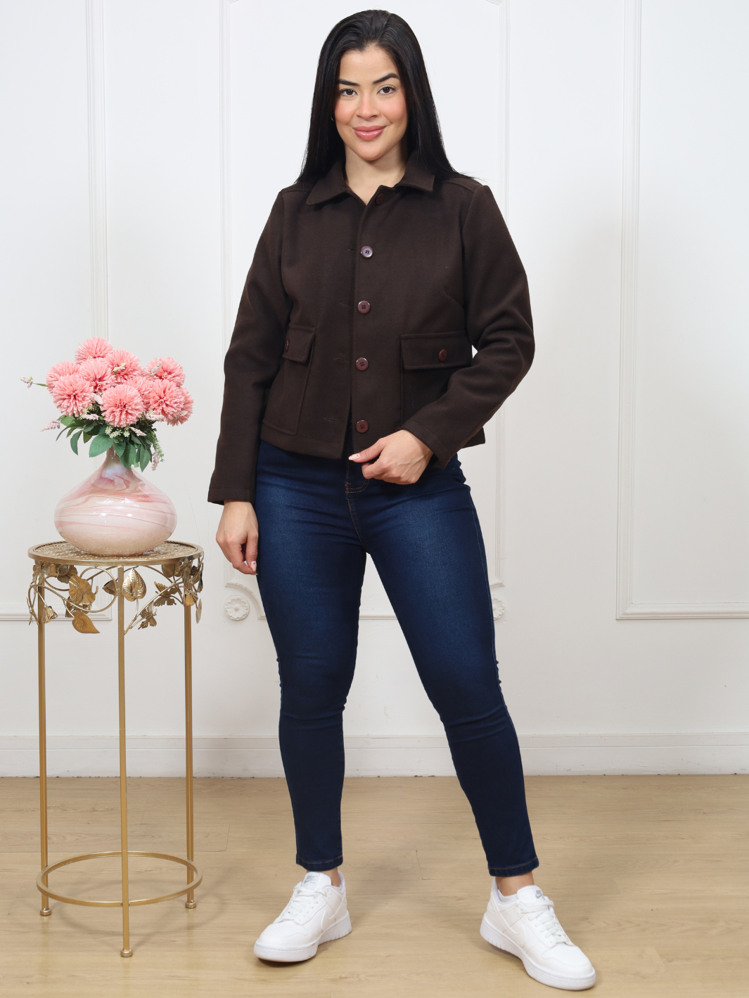Abrígate con estilo con nuestro saco de paño para mujer, diseñado para ofrecerte calidez y sofisticación en cada uso. Cuenta con cuello camisero clásico, bolsillos delanteros funcionales y botones forrados en el mismo tono de la tela para un acabado elegante y uniforme. Su caída estructurada y su diseño atemporal lo convierten en una prenda versátil, perfecta para combinar con vestidos, pantalones o faldas en tus looks de invierno. *Recuerda que las medidas pueden variar +/-1.5cm