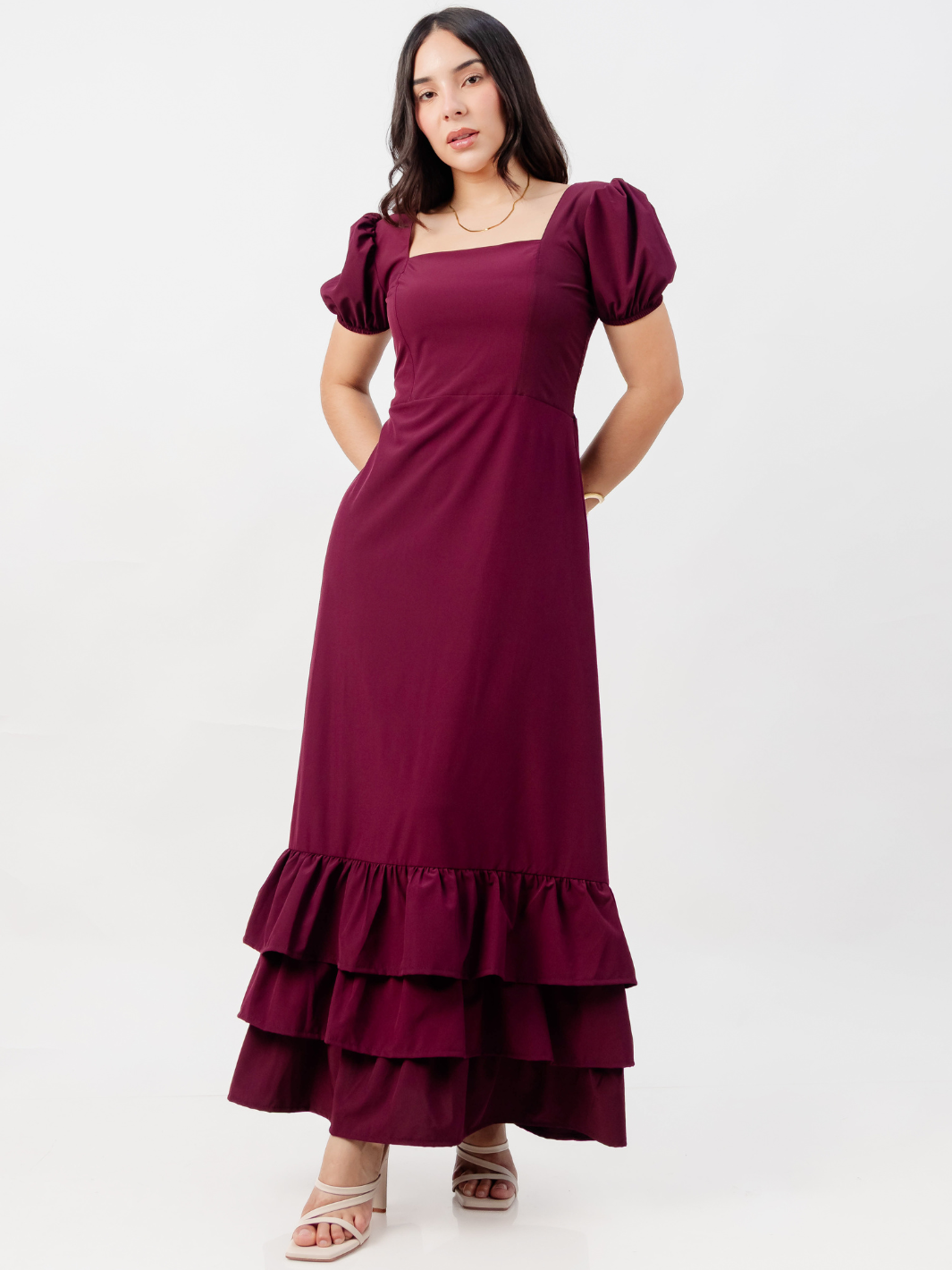 VESTIDO CASUAL CON BOBOS EN LA FALDA RUBI BORGOÑA