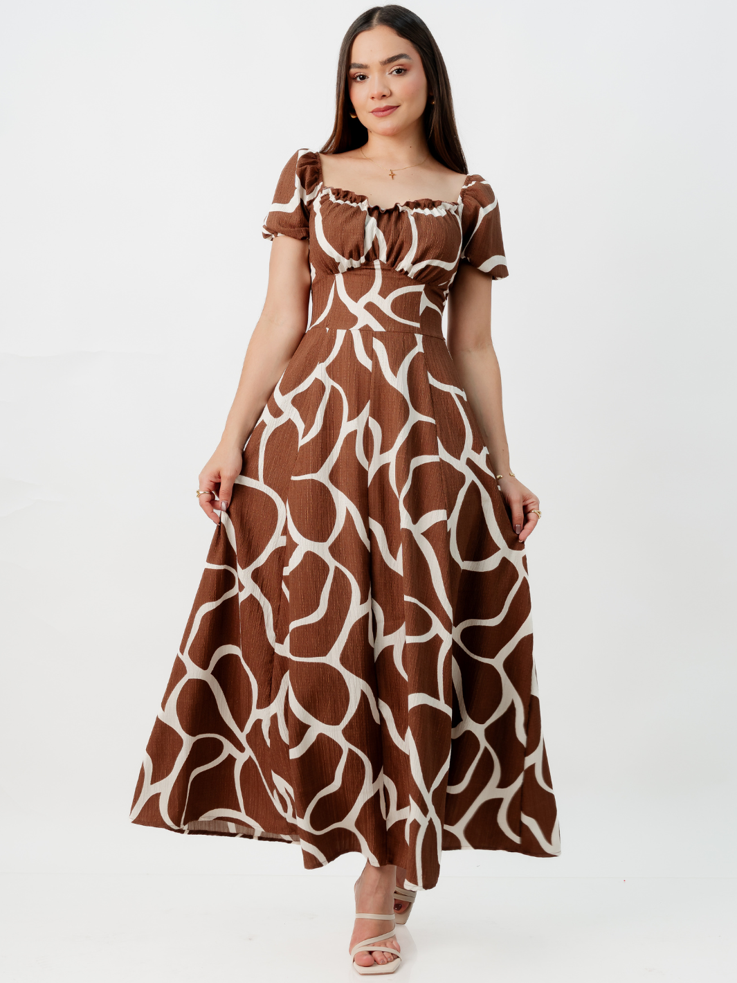 Hermoso maxivestido con diseño tipo corset que realza la figura con un busto delicadamente recogido. Su falda en corte A, amplia y fluida, crea una caída espectacular, mientras que las mangas estilo princesa aportan un toque femenino y elegante. La espalda con multiaguja garantiza un ajuste cómodo y adaptable a tu silueta. Confeccionado en tela Mara, es la prenda perfecta para lucir sofisticada en cualquier ocasión. *Recuerda que las medidas pueden variar +/-1.5cm